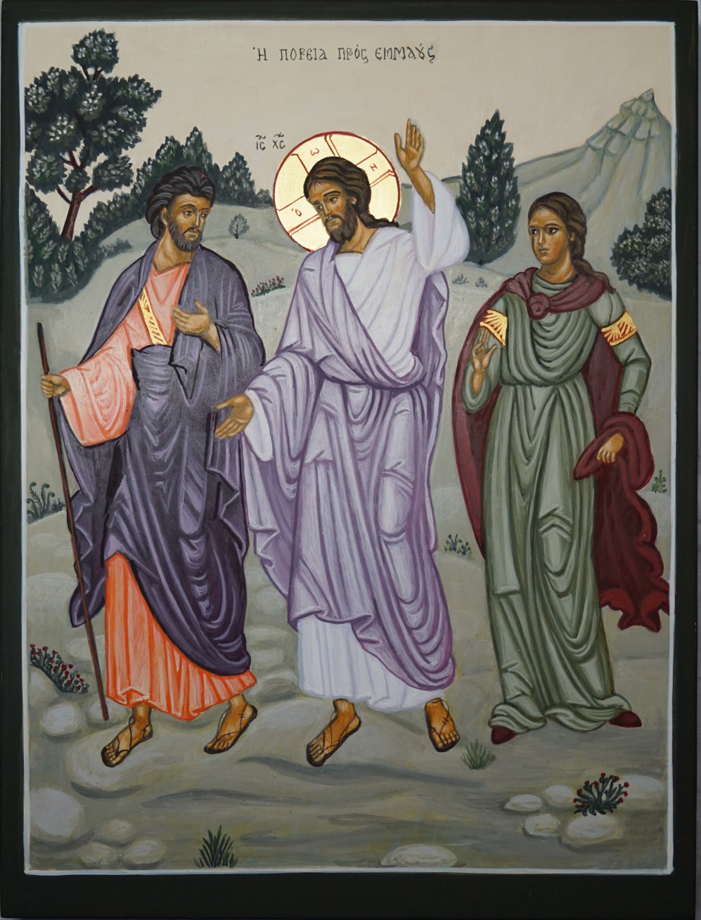 Op deze icoon zijn drie personen afgebeeld, onderweg naar Emmaüs. In het midden is Jezus zelf te zien, herkenbaar aan zijn aureool met kruisvorm en de letters ‘O ω Ν. (Hij die is, De Zijnde).